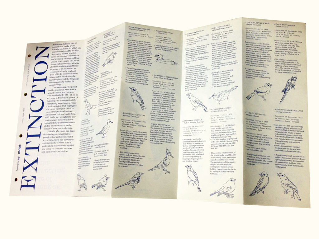 Extinction Calls é uma encomenda a Cláudia Martinho, na qual a artista usa sons de arquivo para criar um percurso de múltiplos encontros sonoros com espécies de aves extintas e criticamente ameaçadas. Escutar esta diversidade de chamamentos e cantos, com as suas variações rítmicas e riqueza tonal, é uma proposta de recuperação do nosso encantamento pela comunicação dos pássaros. É um ato de reivindicar os poderes invisíveis da linguagem da natureza, profundamente enraizada nos seres humanos.